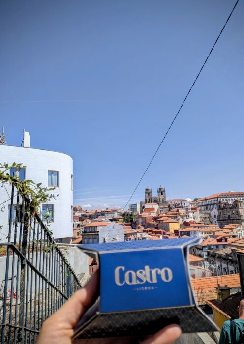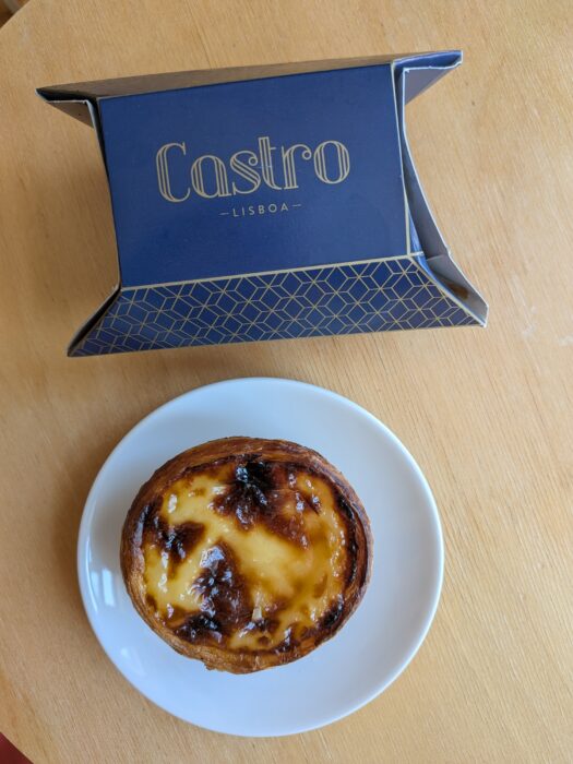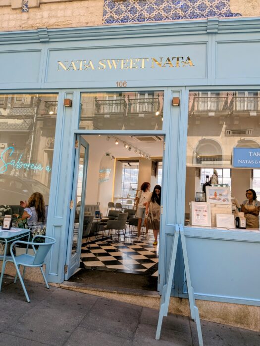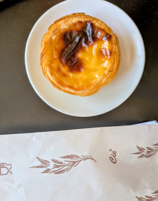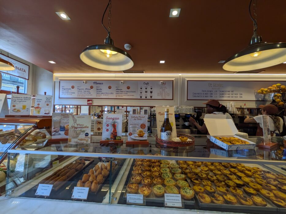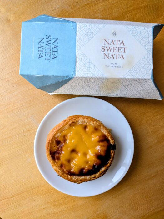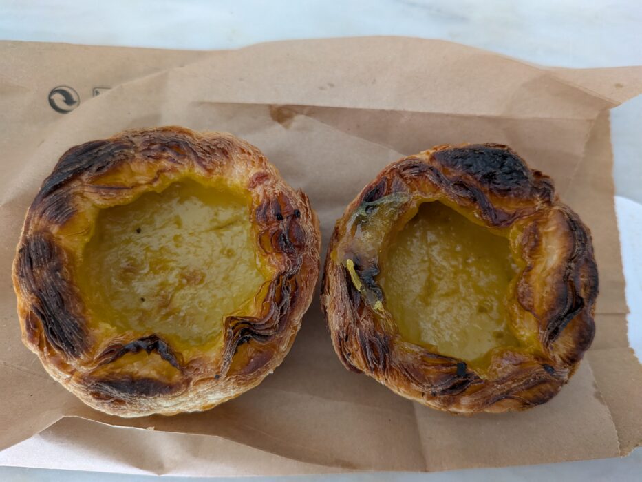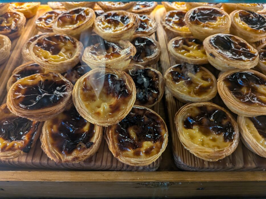 A close-up of freshly baked Pastel de Nata, iconic Portuguese custard tarts, in a Porto bakery.