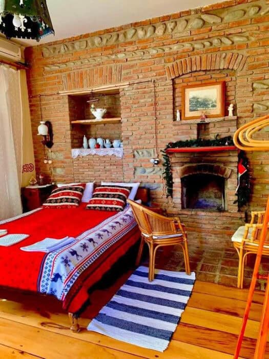 Set against a section of Telavi’s historic old wall, this guesthouse has a character that’s hard to miss. Rooms are simple and well-kept, with wooden floors, soft lighting, and balconies that look out over the rooftops or towards the mountains.